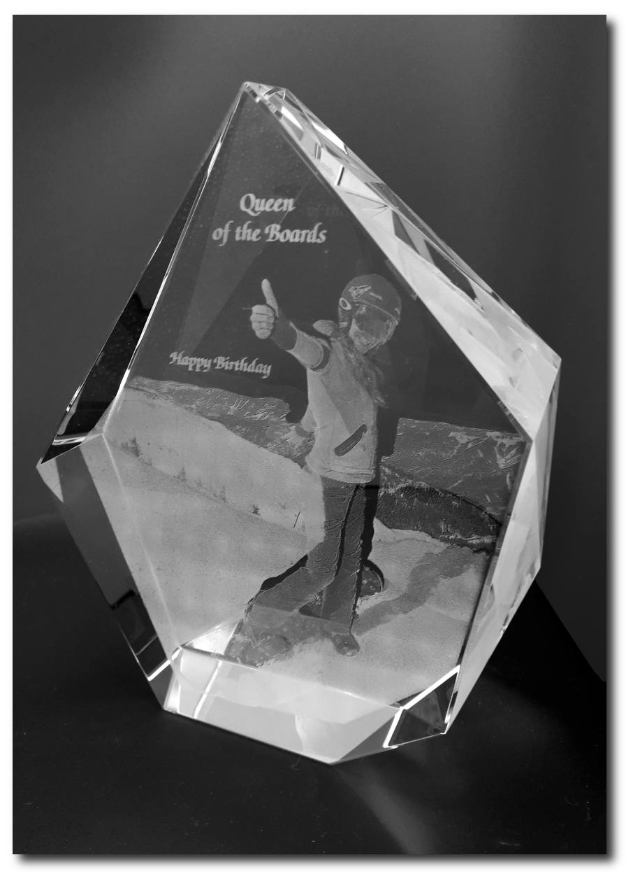 Eine neue Fortentwicklung der Lasergravuren auf Glas ist die Gravur Ihres 3-dimensionalen Motivs in höchster Auflösung in das Innere des Kristallglases. Egal ob Fotos ihrer Familie, Gegenstände oder Logos, wir gravieren ihr Sujets in ihr gewünschtes Glasobjekt. Diese 3D Awards sind besonders als Werbegeschenke oder Give-Aways mit einem "Wow" Effekt, gefragt.