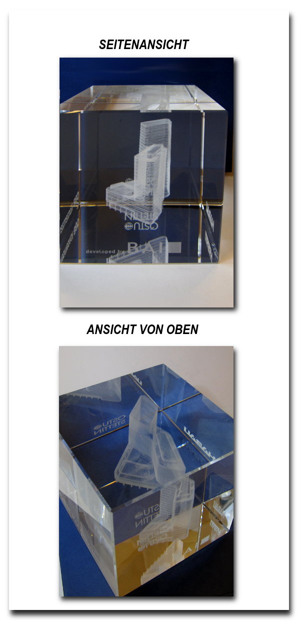 Egal ob Fotos ihrer Familie, Gegenstände oder Logos, wir gravieren ihr Sujets in 3D in ihr gewünschtes Glasobjekt. Diese 3D Awards sind besonders als Geschenke, Werbegeschenke oder Give-Aways mit einem "Wow" Effekt, gefragt.