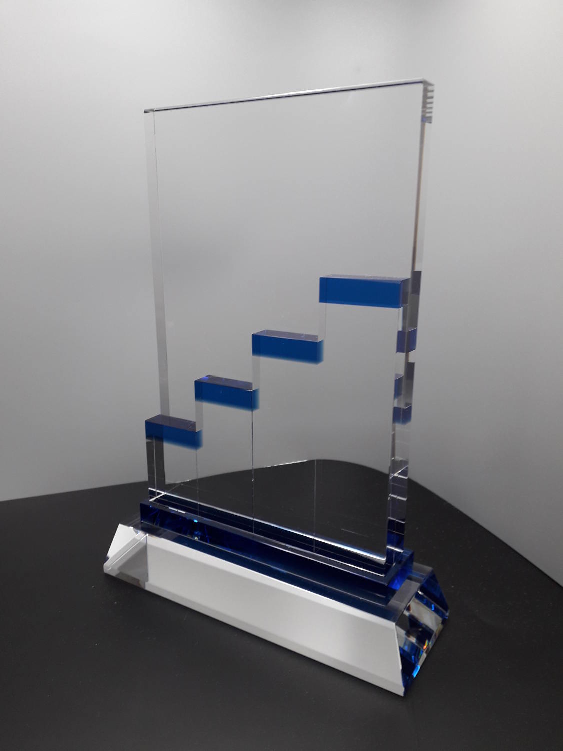 Eine Glastrophäe mit blauen Glasteilen und "Stufen" die den Aufstieg symbolisieren.