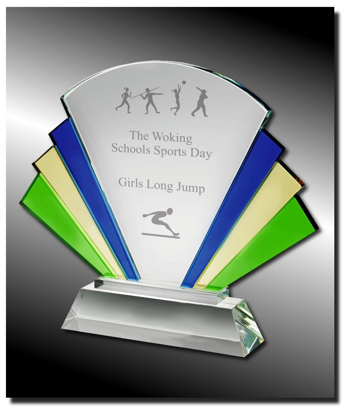 Elegante Glastrophäe in Fächerform mit blauen,gelben und grünen Glasseitenteilen und hohem Glassockel. Hochwertige Verarbeitung, perfekter Schliff und Top Design. Glastrophäe mit Gravur, ein Geschenk für ihre Liebsten oder eine Ehrung für Mitarbeiter und Sportler