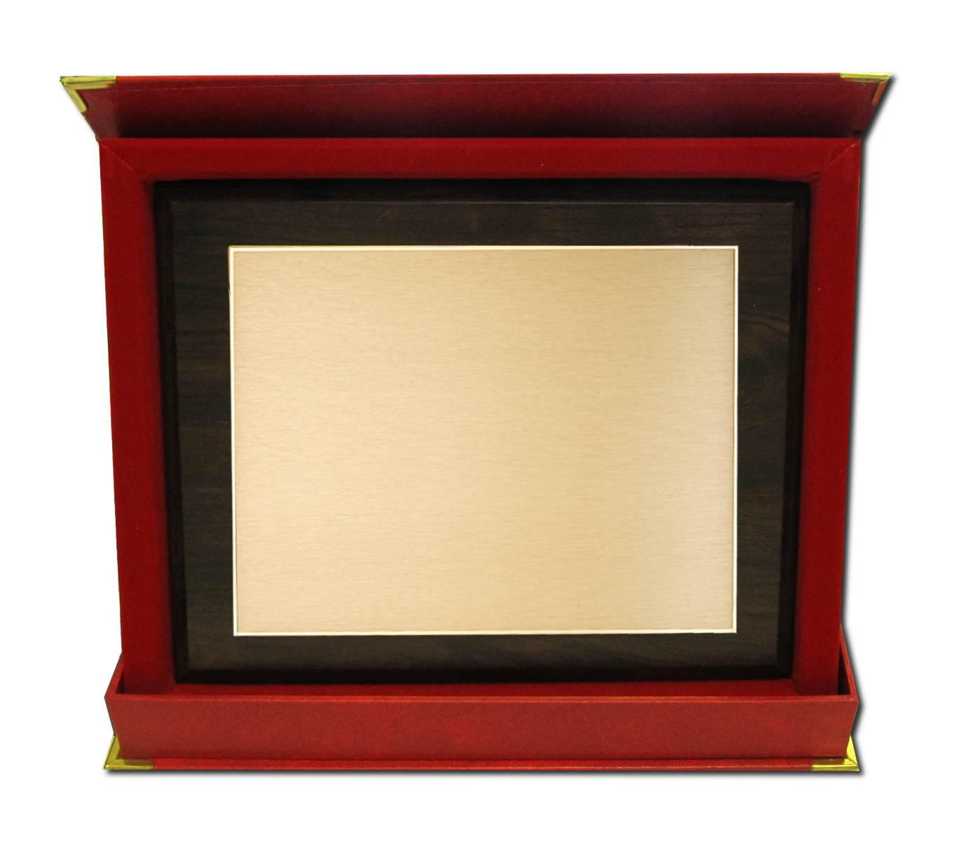 Hochwertige, edle Ehrentafel aus Messing, gebürstete Oberfläche, schmaler Zierrand, montiert auf Holztafel in edler Geschenkskassette.