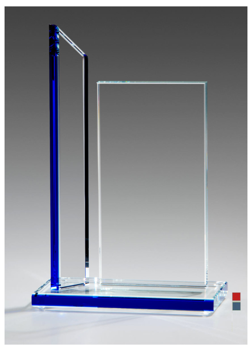 Glastrophäe mit modernem Design bestehend aus 2 Teilen. Schräger Glasteil und Sockel mit Farbkanten aus Glas in den Farben rot oder blau. Die Glastrophäe kann mit einer Lasergravur und/oder hochwertigem UV-Druck versehen werden.