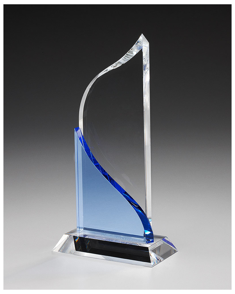 Elegante Schwingungen mit klarem und leicht blauem Kristallglas geben dieser Glastrophäe eine besondere optische Wirkung. Veredelt wird dieser Glaspokal mit einer Lasergravur