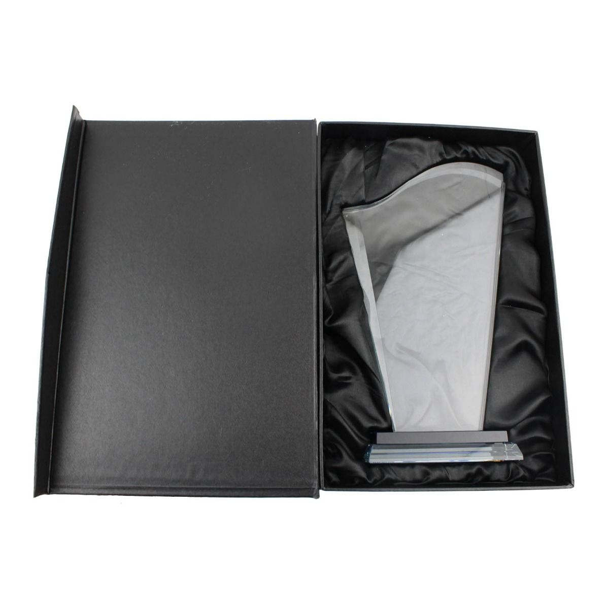 Elegante Glastrophäe in Harfenform mit blauem Glasteil am Sockel. Individualisieren Sie die Glastrophäe mit einer Lasergravur mit Ihrem persönlichen Text
