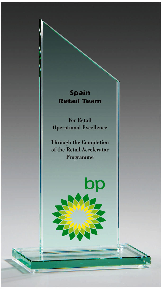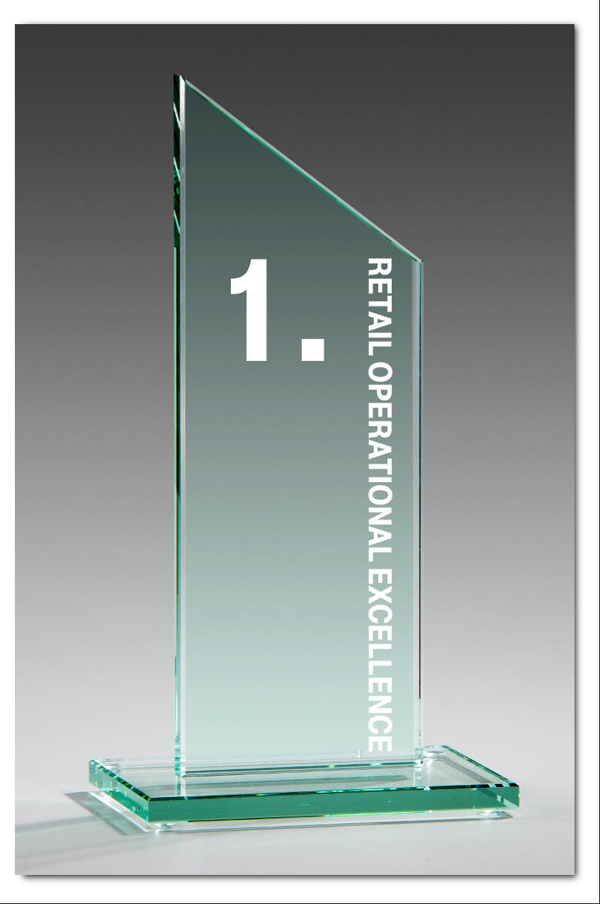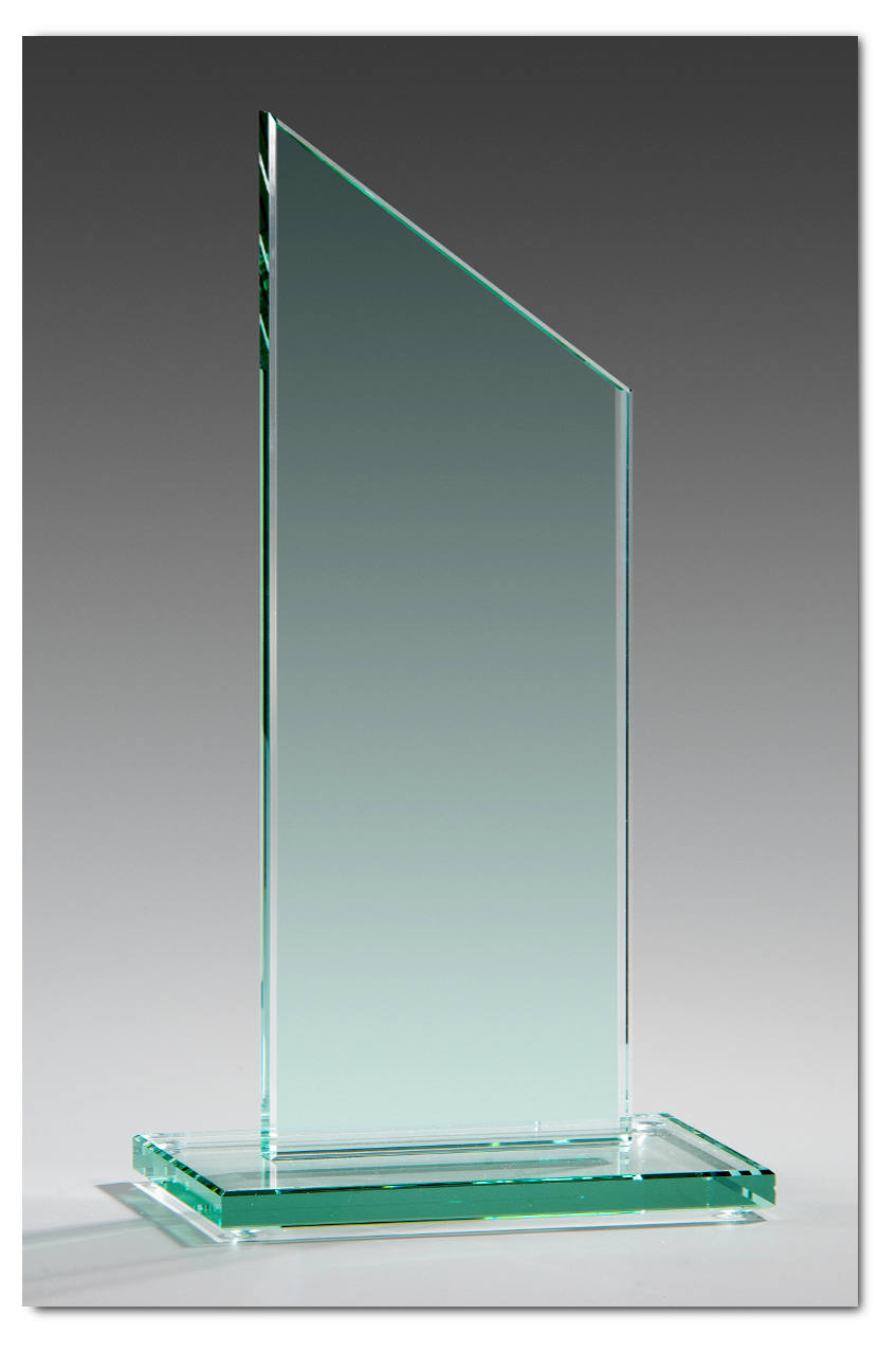 Günstige, moderne Glastrophäe aus Jadeglas - grün schimmernd. Die Glastrophäe kann mit einer Lasergravur und UV-Druck versehen werden.