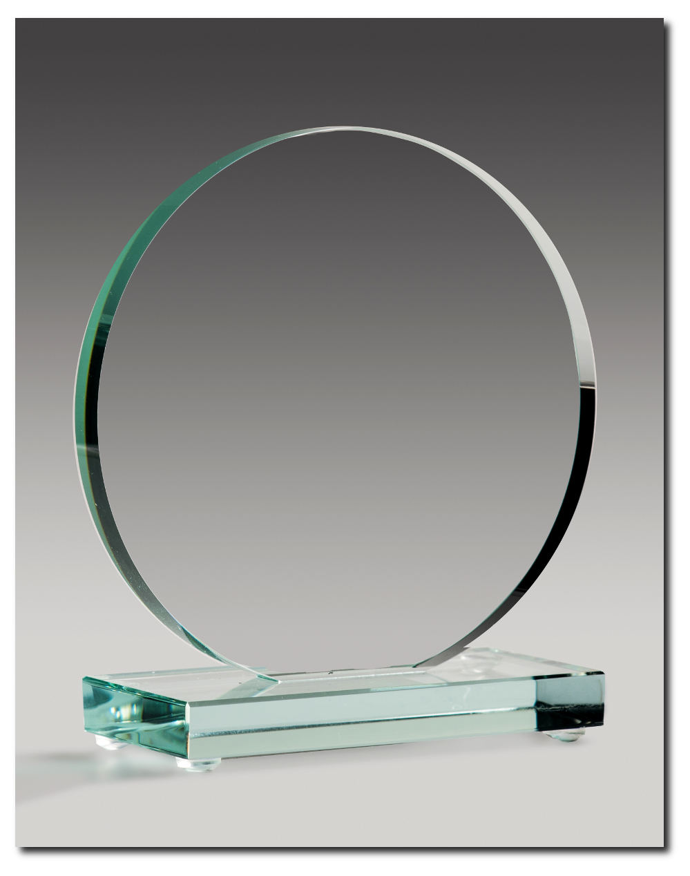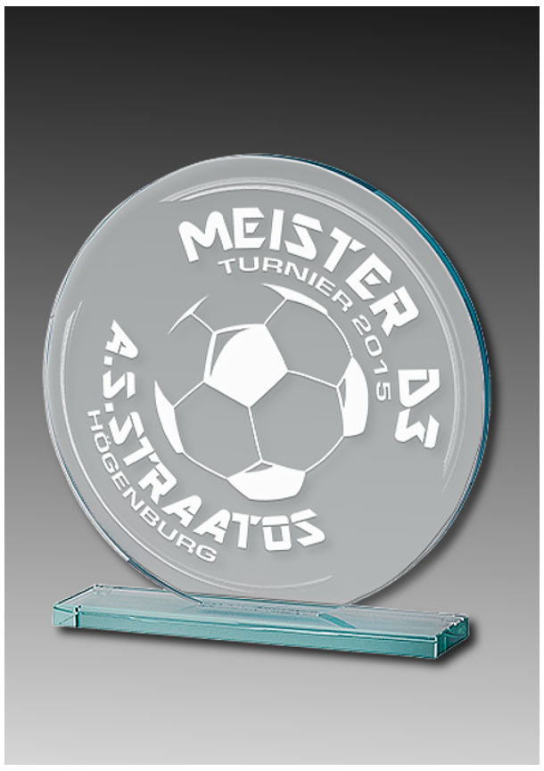 Günstiger, runder Glaspokal aus Jadeglas mit polierten Kanten. Veredelt werden kann diese Glastrophäe mit einer Lasergravur und/oder hochwertigem UV Druck.