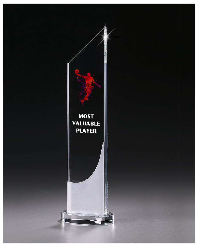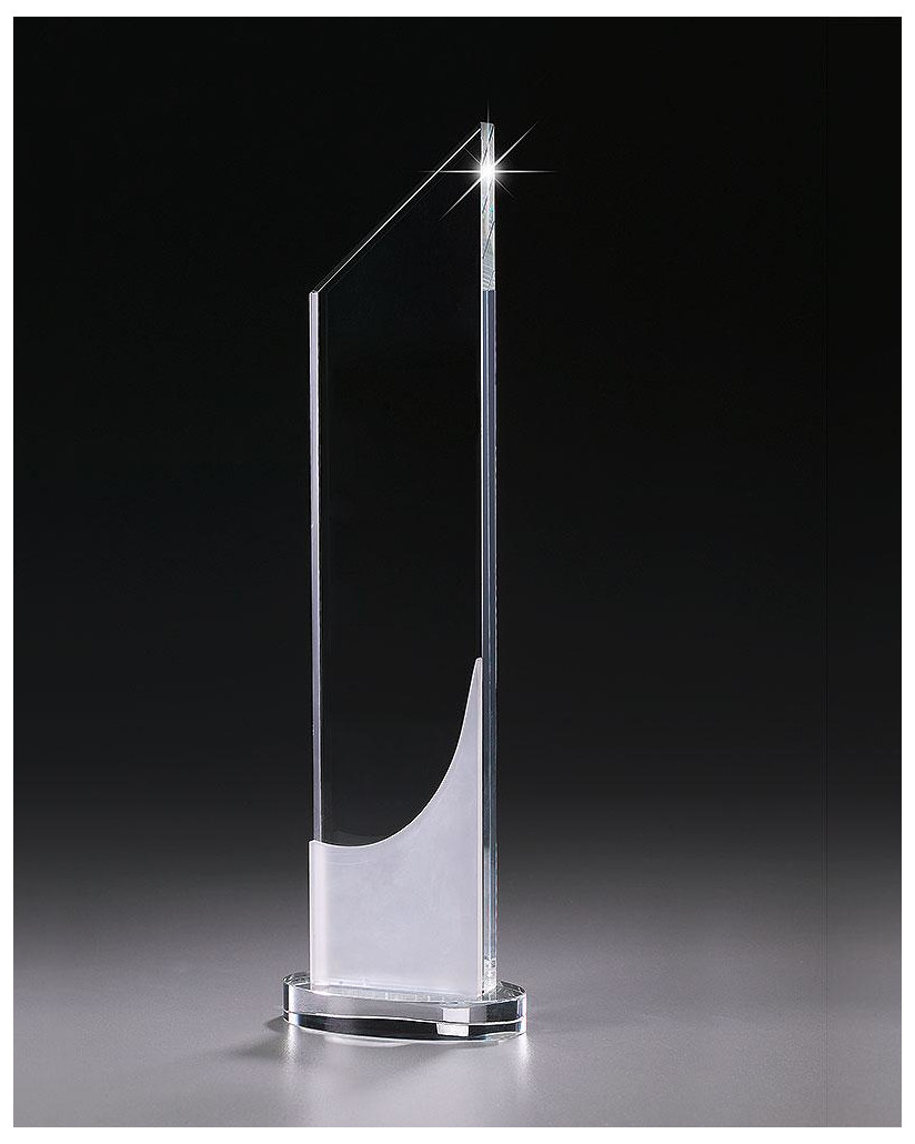 Massives Kristallglas wird kombiniert mit sandgestrahlten, milchig weißen Kristallglasteil. Eine anmutende Kombination, die kühle Eleganz und modernes Design vermittelt. Die Glastrophäe kann mit einer Lasergravur und/oder UV-Druck personalisiert werden.