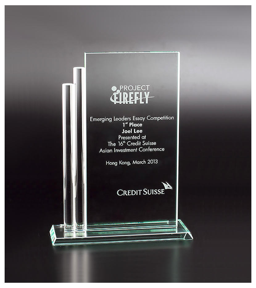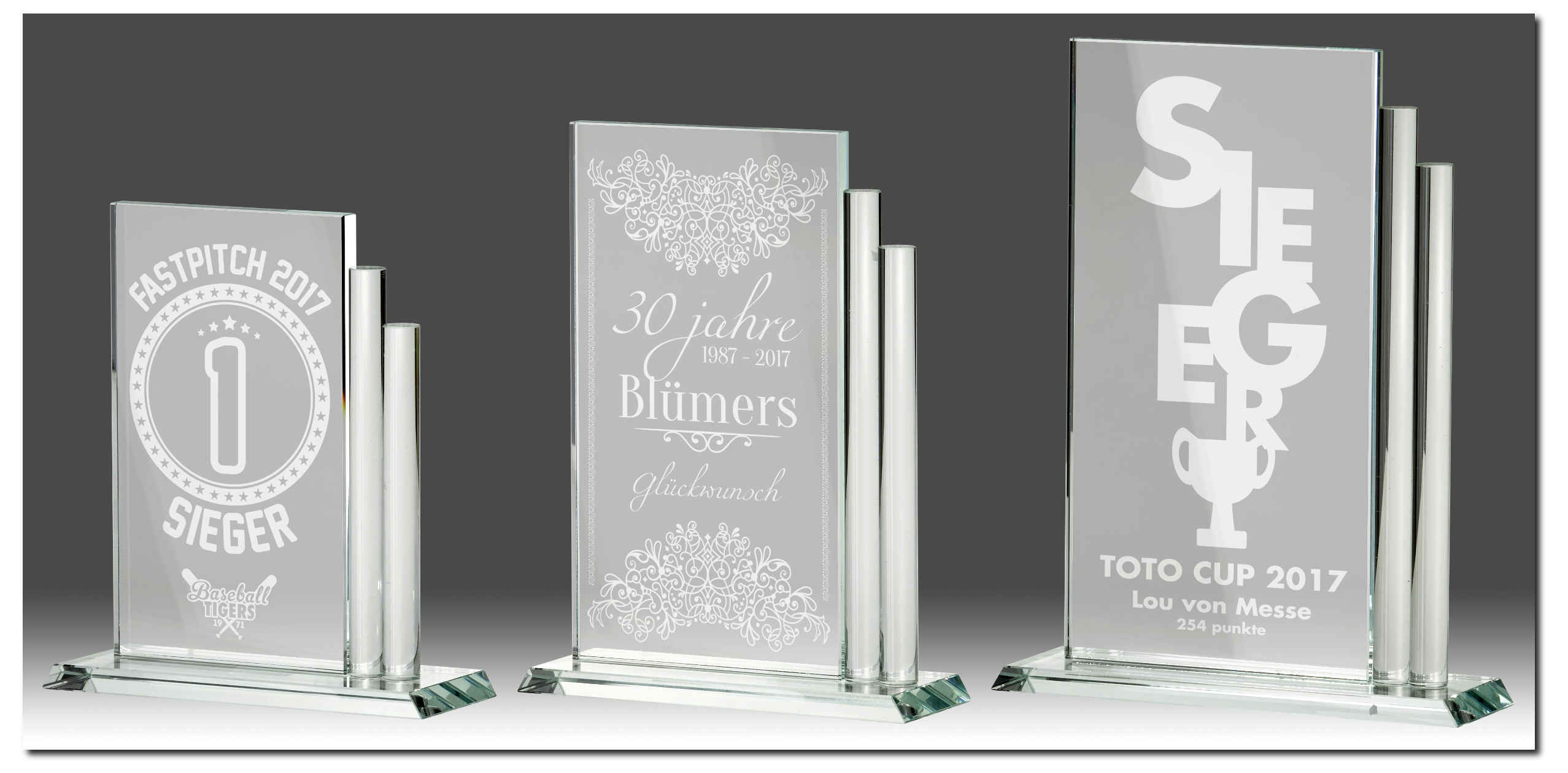 Günstige Glastrophäe mit 2 seitlichen Glasstäben. Viel Platz für ihre individuelle Text-, oder Logogravur. Veredelt werden können diese Glasständer mit einer Lasergravur.