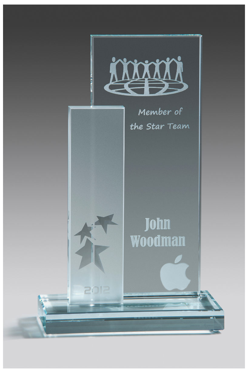 Hohe Glastrophäe bestehend aus 2 verschieden grossen Glasteilen, die individuell graviert oder bedruckt werden können. Der hintere Glasteil kann mittels Lasergravur und/oder UV-Druck personalisiert werden - der vordere, sandgestrahlte Teil wird mittels UV-Druck veredelt.