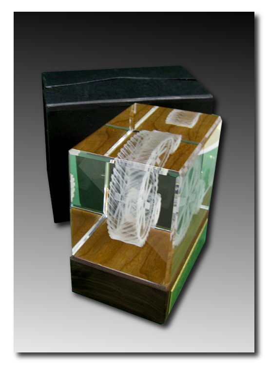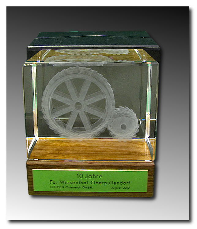 Der Glaquader wurde mit einem 3D Objekt versehen. Der Holzsockel wurde extra angefertigt und eine gravierte Messinplatte aufgeklebt