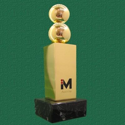 Schwerer Award aus Messing, poliert. Quader und Kugeln sind aus Vollmessing. Montiert auf Marmorsockel. Gravur in 2 Farben eingef&aml;rbt